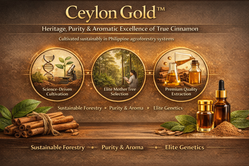 Ceylon Gold™ embodies the heritage, purity, and aromatic excellence of true cinnamon (Cinnamomum verum), cultivated sustainably in Philippine agroforestry systems. Every quill and leaf represents a harmony of science-driven cultivation, elite mother tree selection, and premium quality extraction.