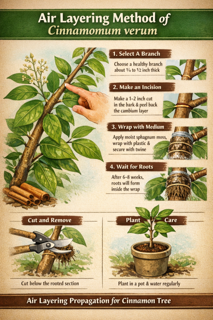 Air layering is a vegetative propagation method that allows you to produce true-to-type cinnamon plants without the need for grafting. It’s especially useful for multiplying elite trees with desirable bark quality and oil profile.
