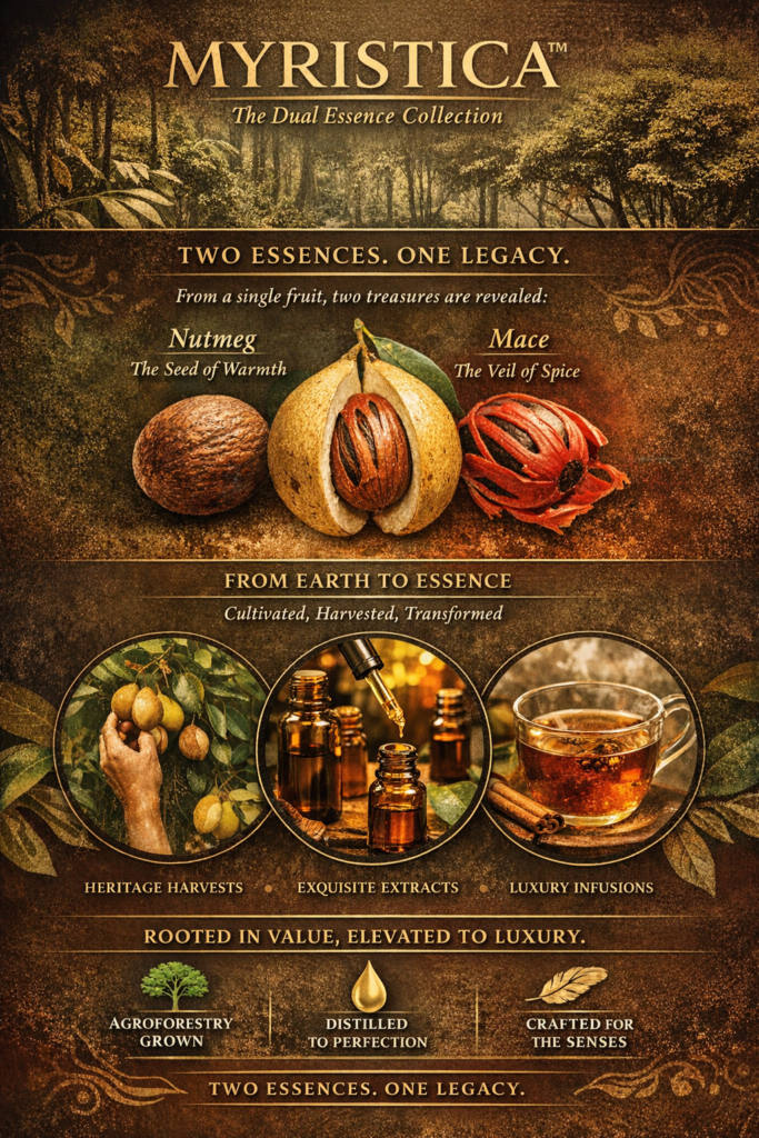 From a single fruit emerges two distinct treasures: the earthy, grounding nutmeg and the delicate, aromatic mace. Each embodies a different story—one of warmth and depth, the other of elegance and refinement. Together, they form the dual essence that defines Myristica™.
